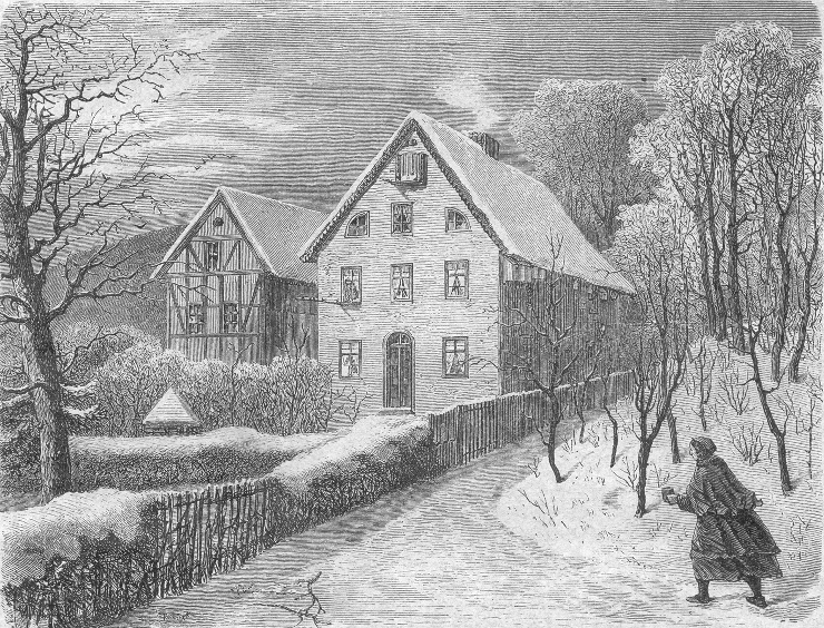 Wohnhaus der Familie Lenz in Schnepfenthal (Stich 1868). Links im Bild ist das kleine Dach des Lenzschen Hausbrunnens zu sehen. Dies ist der besagte Brunnen, der bei Schilderung der "Körperlichen Erziehung der Thusnelda Gertrud Lenzin zu Schnepfenthal, in ihrem ersten Lebensjahre" erwähnt wird. Christian Ludwig Lenz, Lehrer an der Erziehungsanstalt, der Salzmanns älteste Tochter Magdalena ehelichte, erwähnt diesen Brunnen in seinem am 8. August 1792 verfaßten oben genannten Aufsatz, der im "Archiv der Erziehungskunde für Deutschland", III. Bändchen, Weißenfels und Leipzig, bey Friedrich Severin 1793 erschien (S. 163-170). Wiederabdruck des Aufsatzes im Anhang von: Salzmanns pädagogische Schriften Band I. Krebsbüchlein. Ameisenbüchlein. Reichl Verlag, St. Goar 2007. |