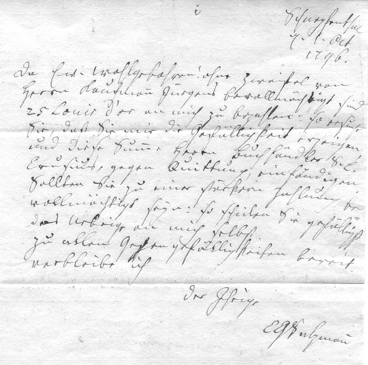 zahlen soll, gegen Quittung an Buchhänder Crusius zu zahlen. Brief vom 1. X. 1796.